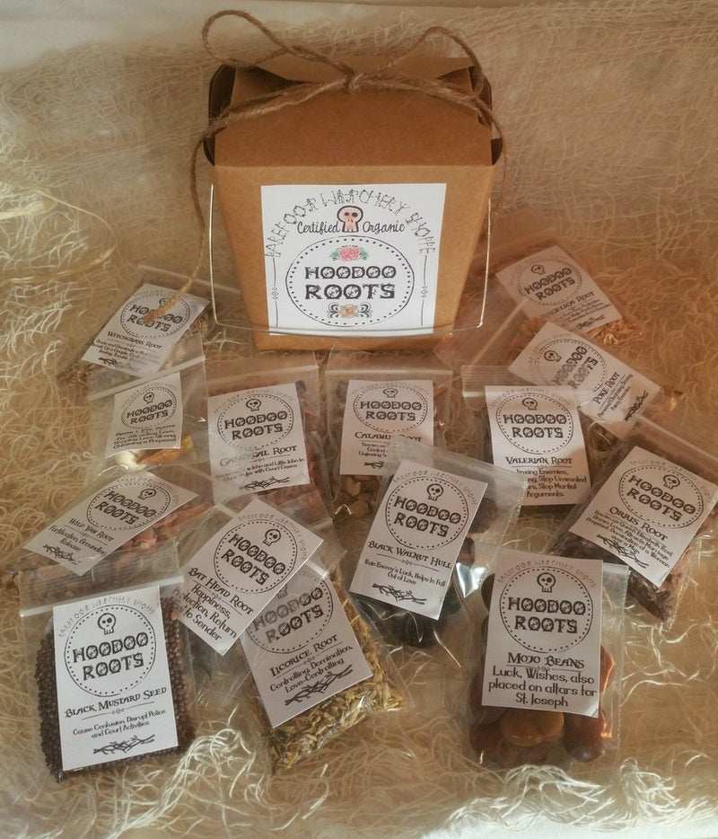 Hoodoo Roots Box, from the Barefoot Witchery Shoppe's Organic Herbal Apothecary. 15 roots/seeds/beans are included in this set. Each comes in a resealable 2" x 3" bag (unless size is otherwise noted in the following listing.) and they are all packaged in a 4"x6" Kraft paper Chinese takeout box. This set would be a great starter kit for someone...