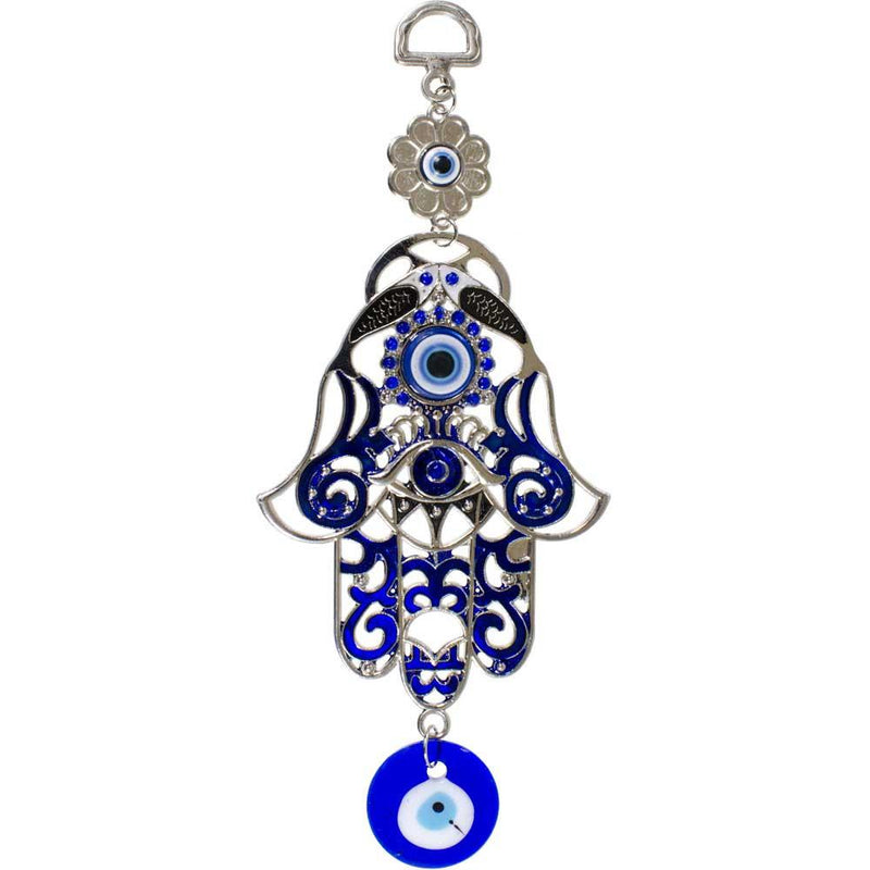 This hanging eye amulet features a lovely blue and silver toned filigree Fatima hand. On top of the hand is a sparkling jeweled flower and on the bottom hangs a large glass evil eye charm. Hang this powerful talisman on a wall, door or anywhere that happiness and protection are needed. This Amulet originates from Turkey, where it was believed ...
