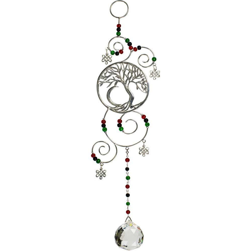 At the center of this silver-toned, spiral home talisman is a beautifully molded Tree of Life. Woven throughout the spirals are red, green and black beads. Silver-toned eternity knots dangle from the spirals branching off from the center tree and the attached loop makes hanging easy. From the base hang a matching strand of beads and a stunning m...